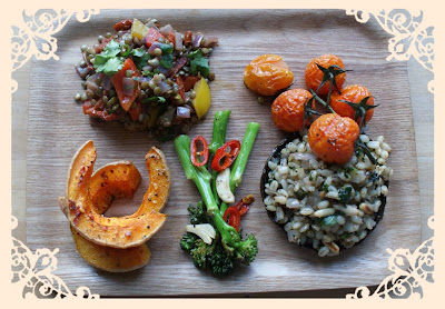 3. Place the dough on a baking tray (a pizza tray is best). Spoon a generous layer of the tomato sauce onto the base and add topping of your choice. (I topped mine with grilled aubergine, peppers & courgette, basil oil and cashew nut 'cheese')